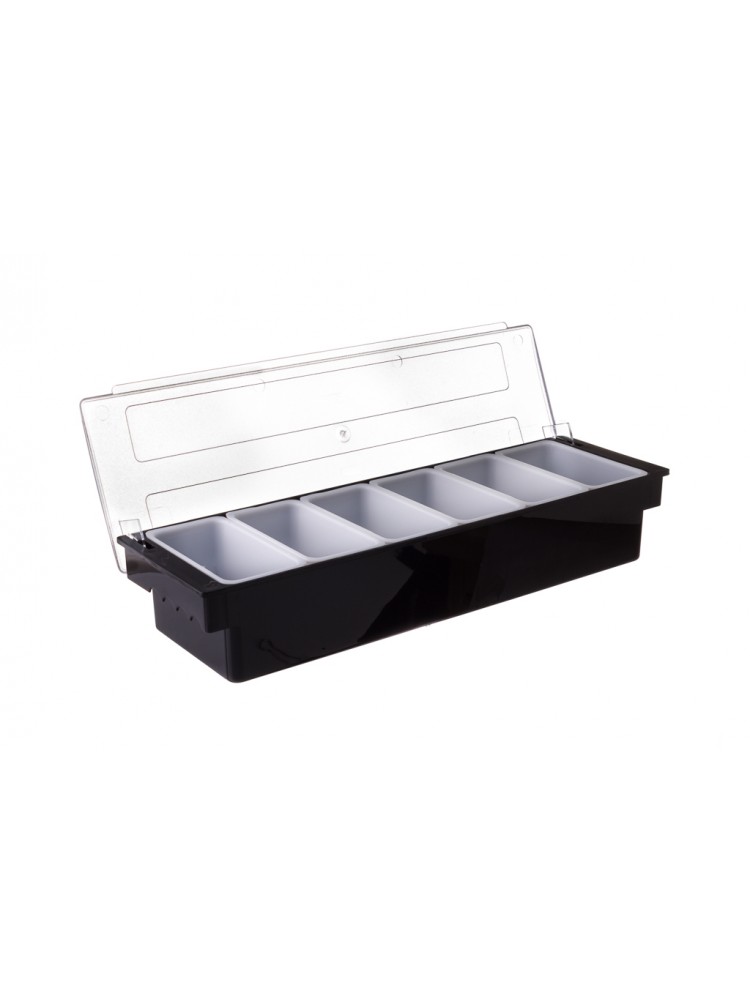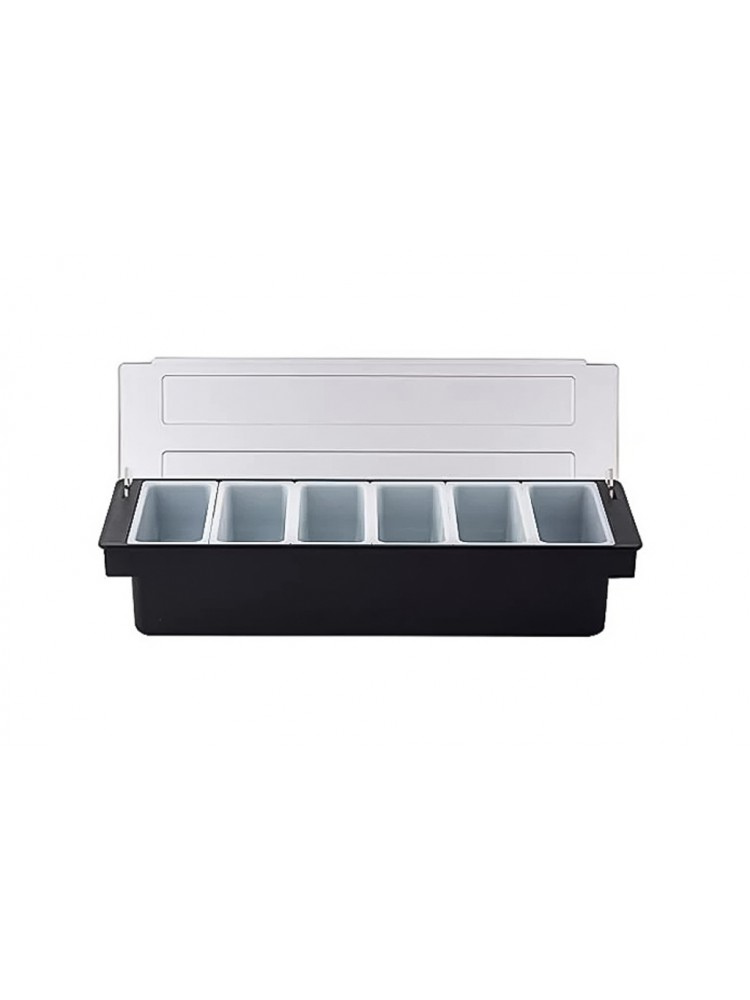 A tampa transparente articulada protege os condimentos de poeiras e contaminações, mantendo-os frescos durante o serviço. Ideal para armazenar limão, lima, cerejas, azeitonas, pepino ou outras guarnições utilizadas em cocktails.