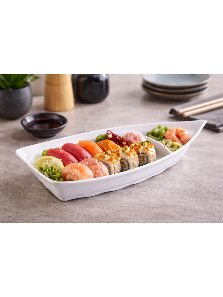 Perfeito para apresentação de pratos, entradas, sushi ou petiscos, este barco em melamina combina resistência, leveza e estilo para uso profissional em hotelaria e restauração.