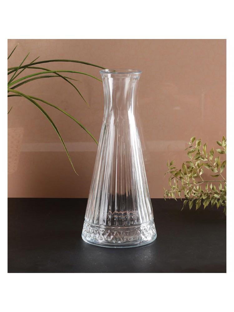 Fabricada em vidro transparente de alta qualidade, apresenta um design sofisticado com relevo lapidado na base e linhas verticais que valorizam a apresentação das bebidas. A tampa em vidro assegura proteção do conteúdo, mantendo higiene e frescura, enquanto complementa o visual refinado da peça.