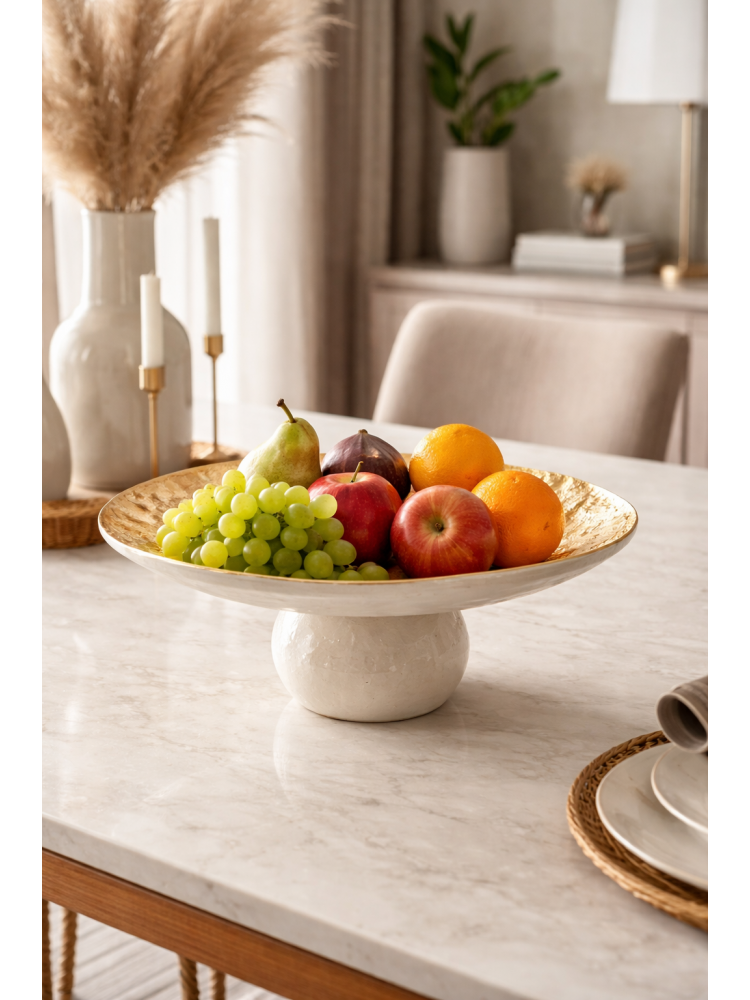 Esta fruteira em alumínio é a peça perfeita para quem busca unir funcionalidade e design contemporâneo. Com acabamento texturizado na parte interna e detalhe em dourado, ela traz um toque de requinte e modernidade ao ambiente. Sua base robusta garante estabilidade, enquanto o formato orgânico valoriza a apresentação de frutas ou objetos decorativos.