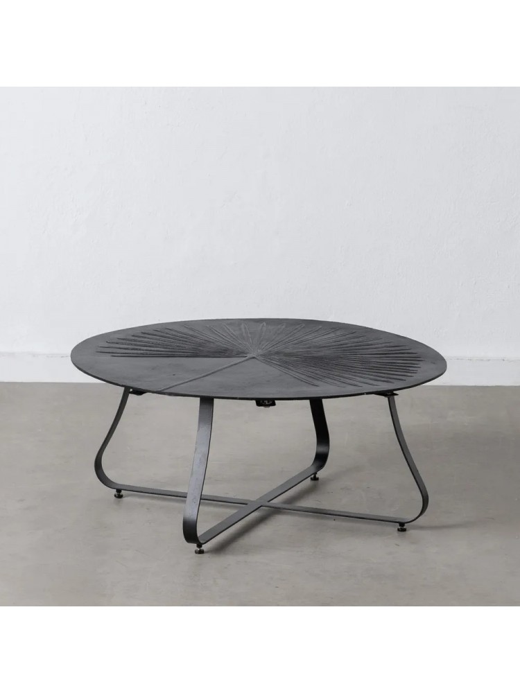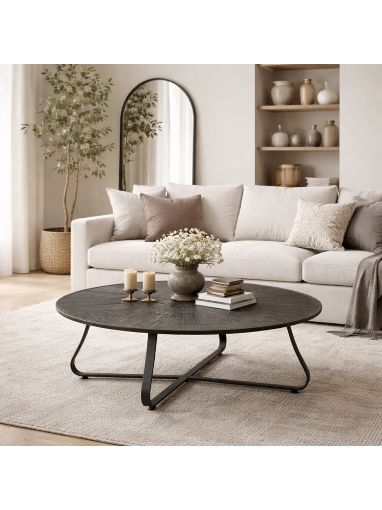 Mesa de café redonda em metal preto com design contemporâneo e tampo texturizado de inspiração orgânica. A estrutura metálica confere estabilidade e resistência, enquanto o acabamento escuro e elegante torna esta peça ideal para salas de estar modernas, lounges, hotéis ou espaços comerciais.