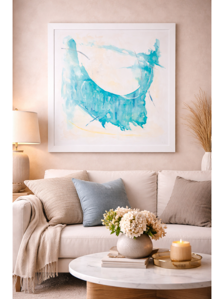 Quadro decorativo com composição abstrata em tons vibrantes de turquesa, azul e suaves nuances de bege, criando uma peça leve, moderna e cheia de movimento. As pinceladas fluidas e expressivas conferem dinamismo à obra, tornando-a ideal para ambientes contemporâneos que procuram cor sem perder elegância.