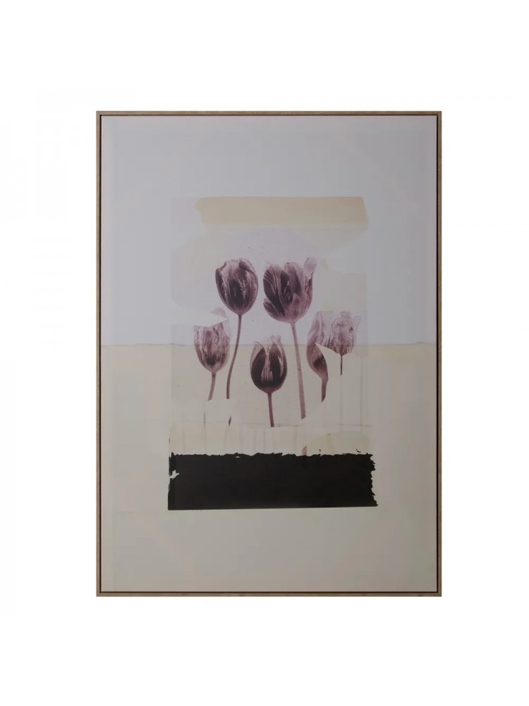 Quadro decorativo com composição floral abstrata, destacando delicadas tulipas em tons suaves de bordeaux sobre fundo neutro com blocos de cor em bege e preto. A combinação entre elementos orgânicos e traços contemporâneos cria uma peça elegante e sofisticada, perfeita para ambientes modernos.