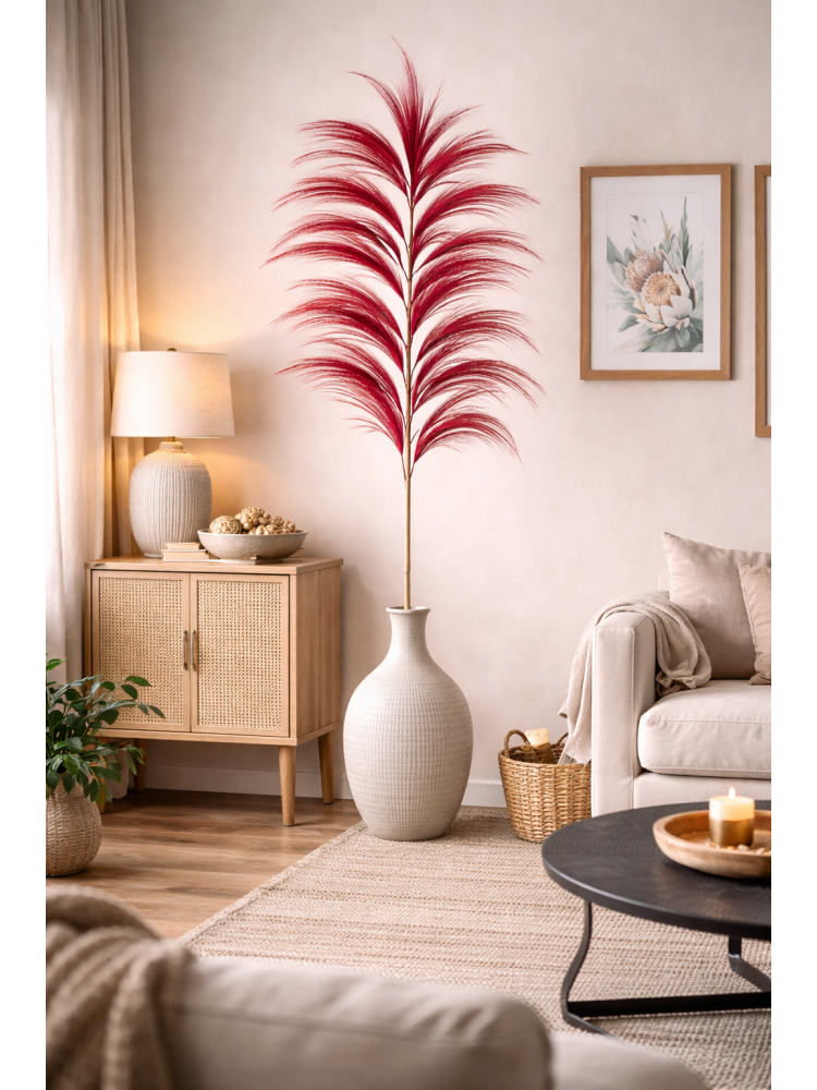 Rama decorativa vermelha em fibra natural, ideal para complementar arranjos florais e dar um toque sofisticado à decoração. O seu design leve e delicado acrescenta textura, cor e elegância a jarras, centros de mesa ou espaços modernos e contemporâneos.